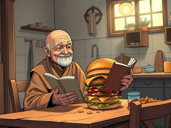 At breakfast, the senior monk sat quietly, reading while eating. Two disciples watched, puzzled. “You told us to only do…