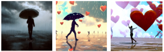 As the scene evolves, the raindrops undergo a magical metamorphosis, transforming into delicate heart shapes. The atmosphere shifts from adversity to love, creating a surreal environment. Puddles on the ground reflect this change, now filled with hearts instead of mundane rainwater. Yet, the person persists with the umbrella, seemingly unaware or resistant to the love raining down upon them.